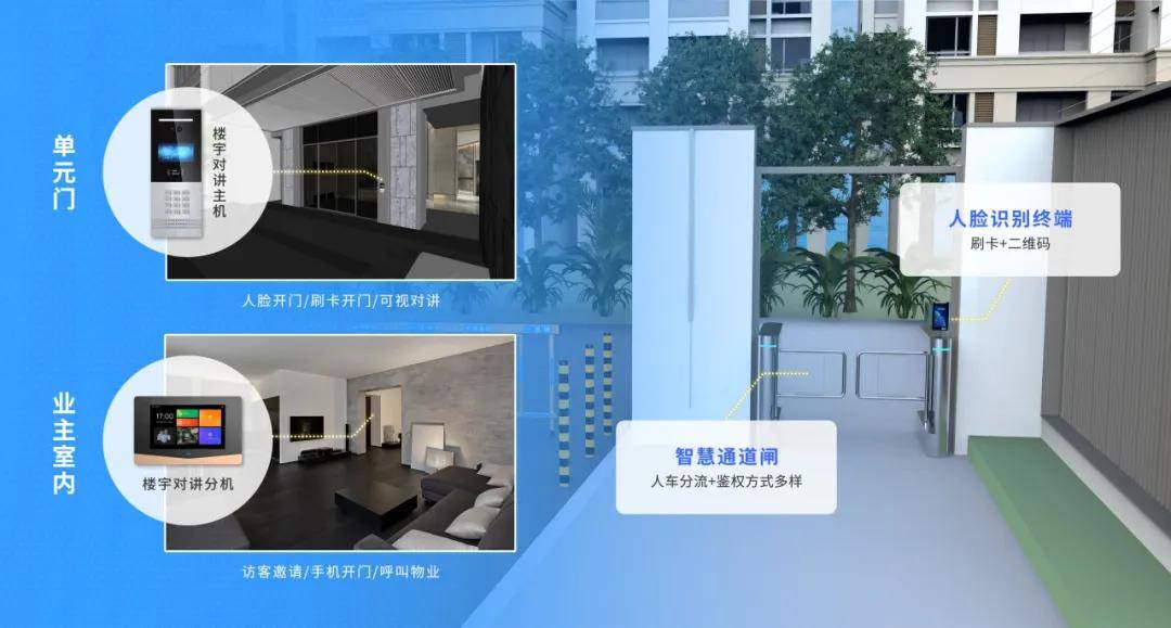物业常因业主忘带门禁卡求助、单元门开关需要协助等小事降低工作效率。方案在社区大门和单元门部署人脸识别设备,业主刷脸即可开门,无需携带门禁卡;业主还能通过手机 APP 远程开门,减少了物业的协助工作,让业主通行更自主。