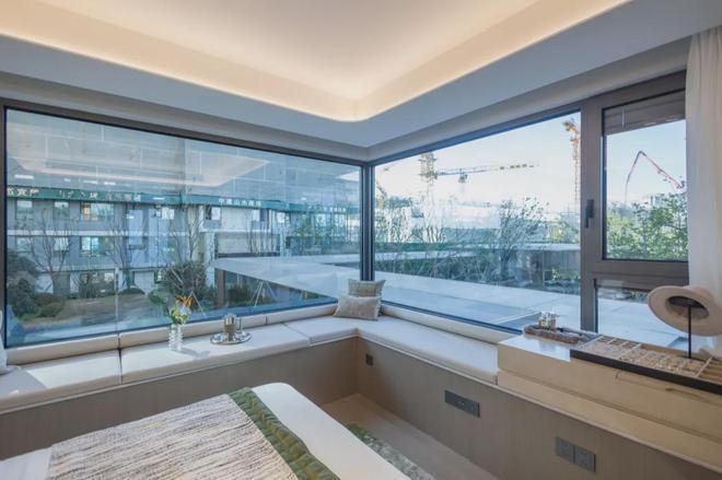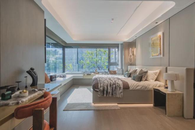 主卧套房设计,预留衣帽间空间,带独立卫生间;主卧的飘窗,是一大亮点所在,270°转角飘窗,带来环幕级景观视野。