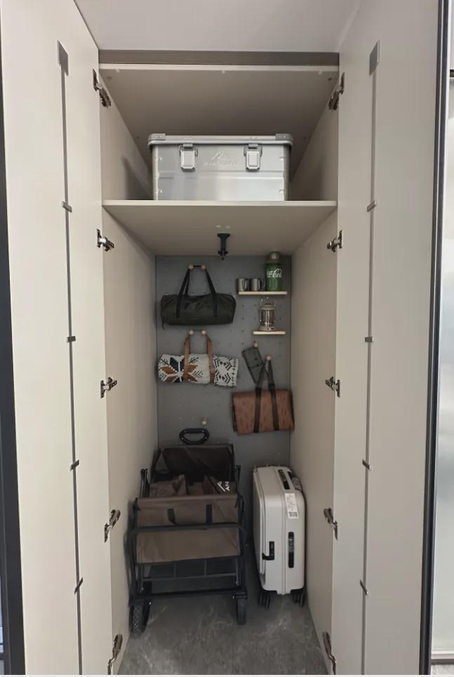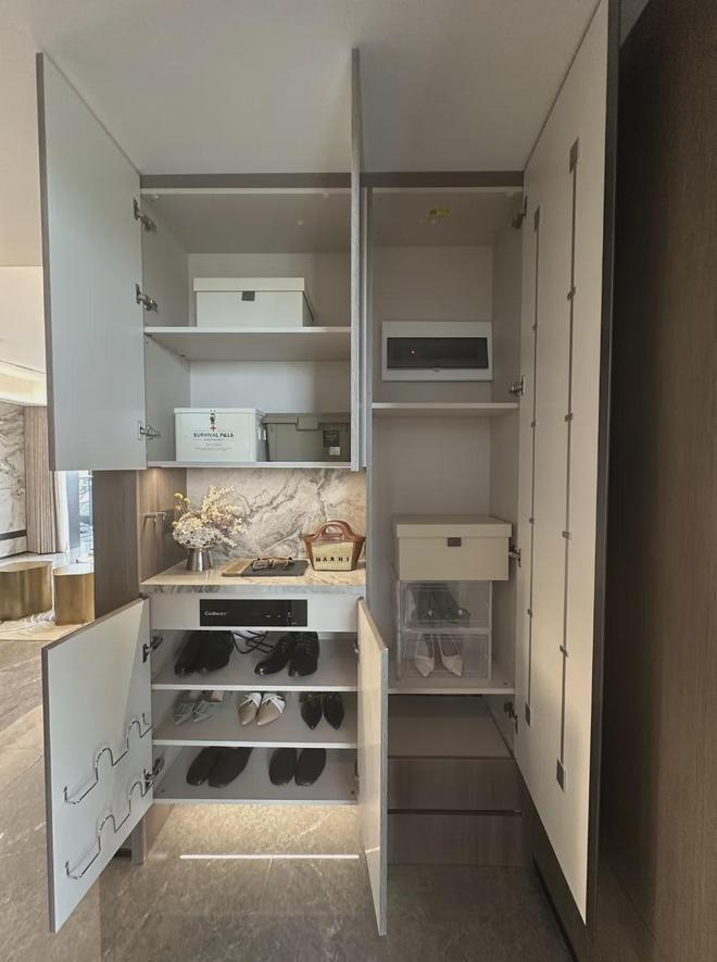 建面约144㎡洋房,一梯两户,电梯双开门,玄关位置,单独做有储藏空间,可以将大件的行李箱、滑板车等等置入: