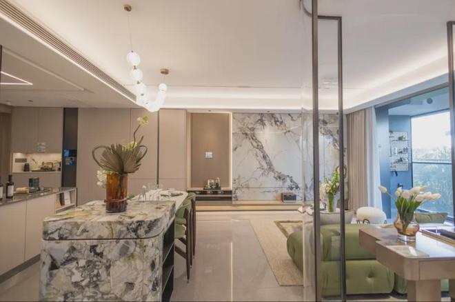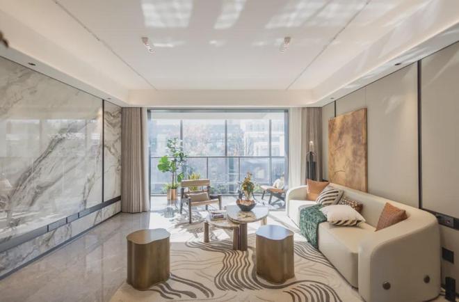 整体大面宽客厅,以岩板背景墙作为点缀装饰,弧形吊顶,造型别致,空间品质大幅提升: