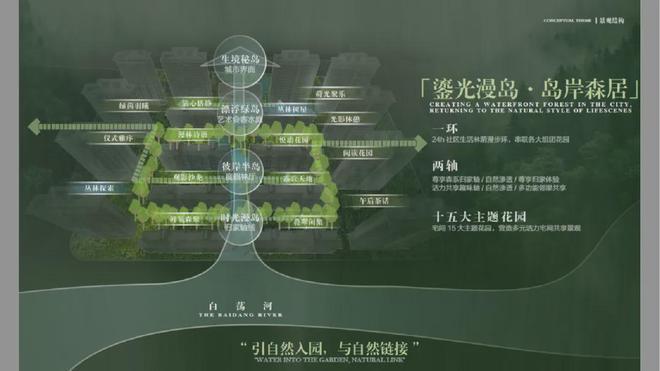 整个社区内,项目规划“一环两轴十五园”景观布局,将水岸、岛屿、森林、花园、树屋作为园林节点,营造出沉浸式山水活力场域。