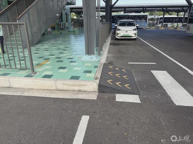 随后,沈先生带着记者前往上海南站北广场的交通枢纽区域。这里看起来是不久前才新建的公交站,有729路、763路等公交线路驶进发出。不同线路站点间的柏油路面上,印着斑马线,但高高的路肩仍没有设置缓坡,记者观察发现,在这上下车的一多半手里都拉着行李箱,拎上拎下,可谓非常不便。